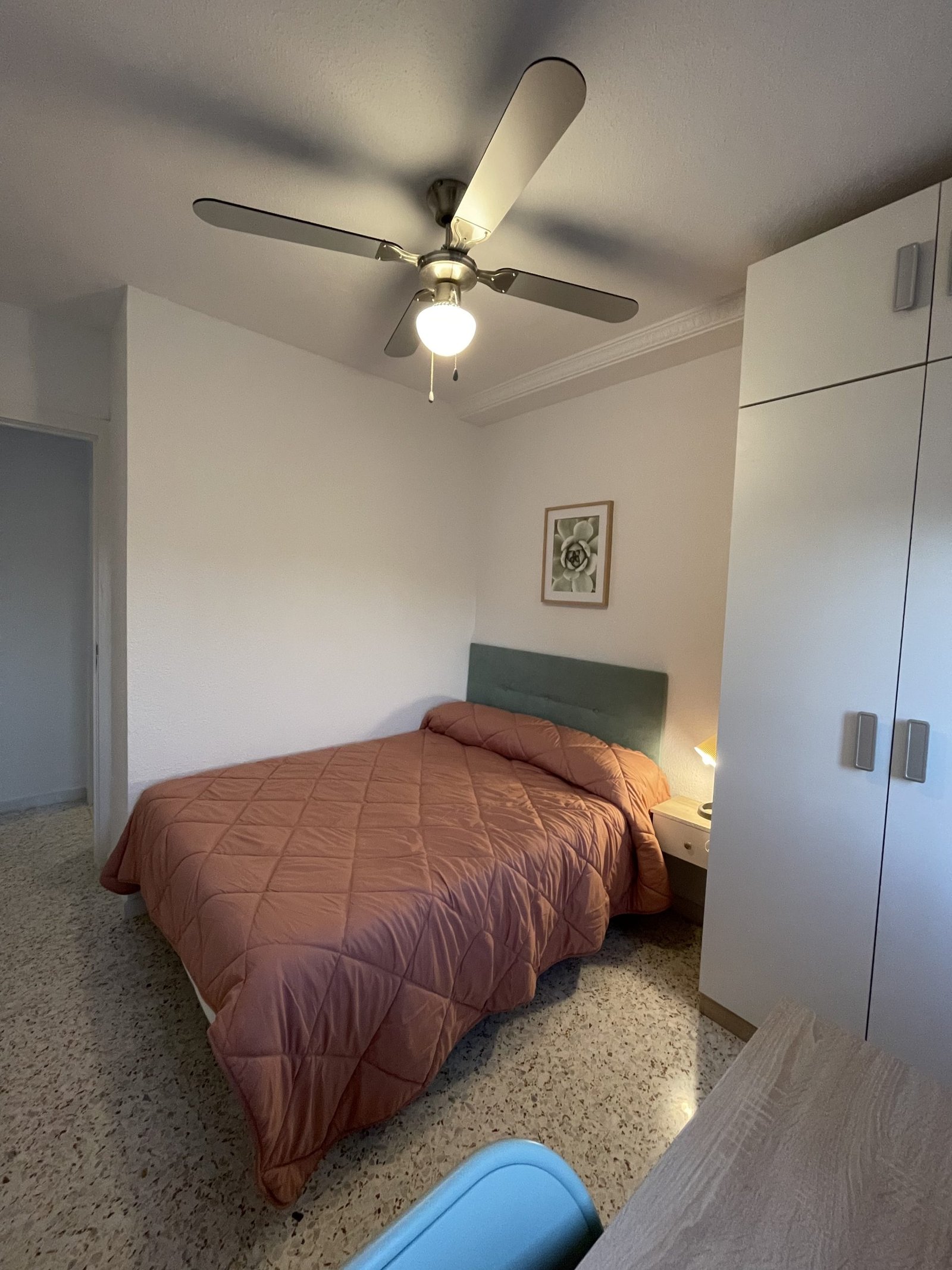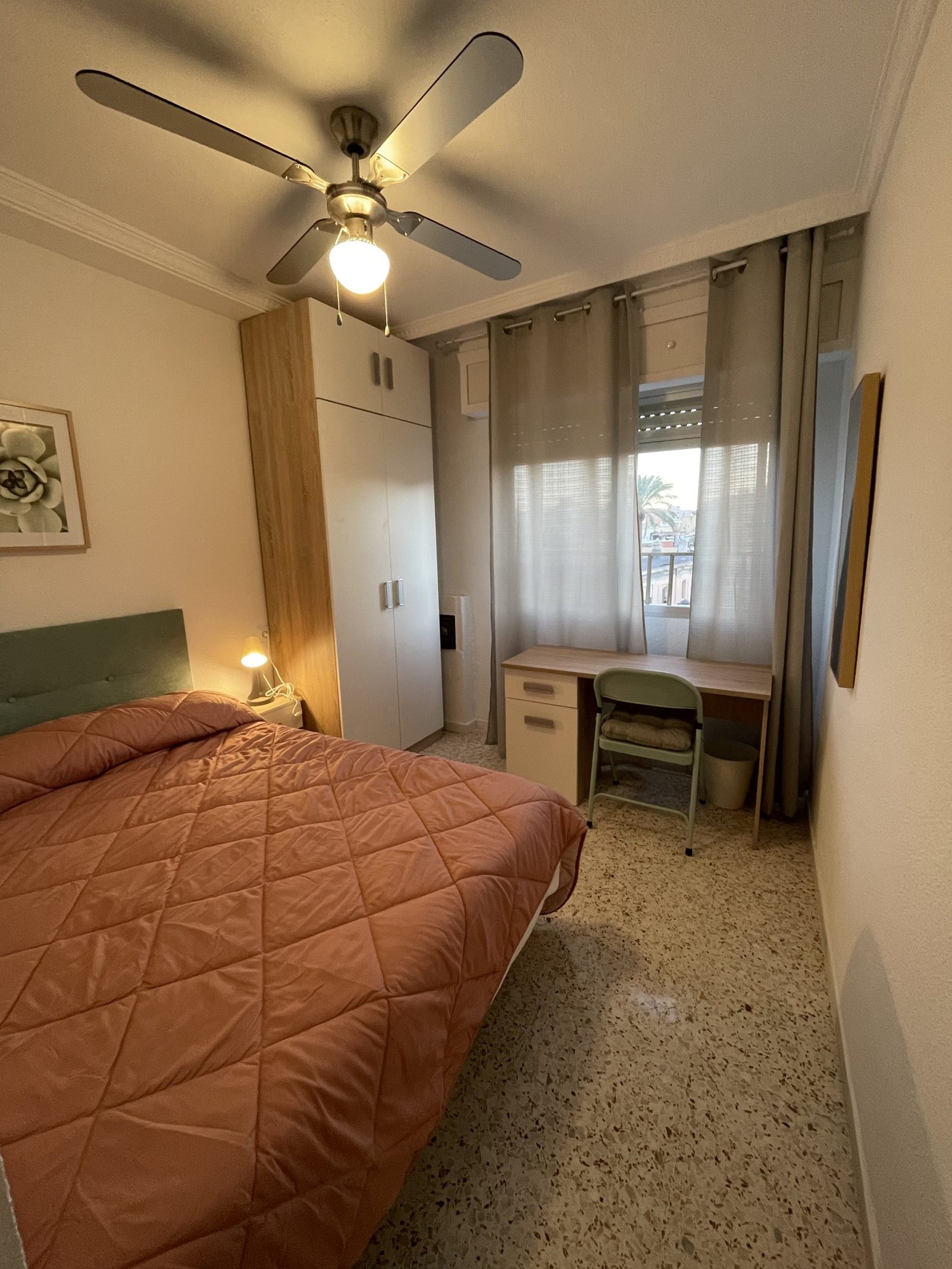 Habitación con cama doble (135 x 190 cm) y cerradura con llave para total privacidad, armario, mesa de noche, mesa escritorio con silla y ventilador en el techo. Ventana con vistas a la calle.